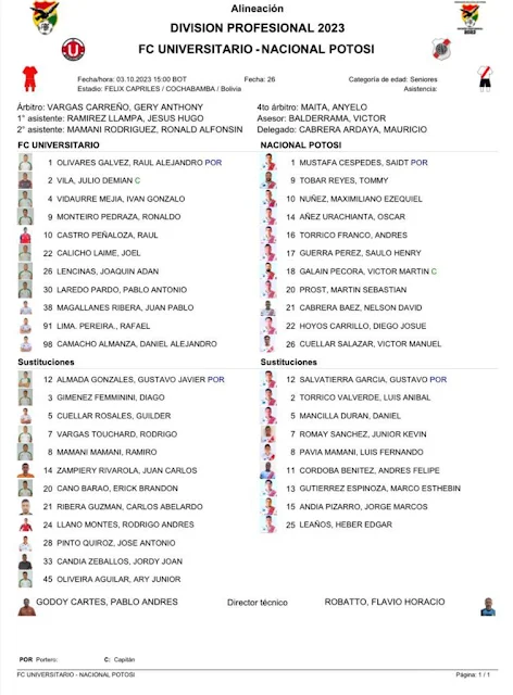 Alineaciones Universitario de Vinto vs Nacional Potosi